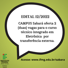 As inscrições para o curso técnico integrado ao Ensino Médio em Eletrônica podem ser feitas até o dia 25 de abril. Este Edital é destinado aos candidatos regularmente matriculados em cursos técnicos integrados de outras instituições de ensino da rede federal de Ensino que desejam transferir-se para o curso técnico integrado em Eletrônica (Anexo I) no IFMG campus Sabará.